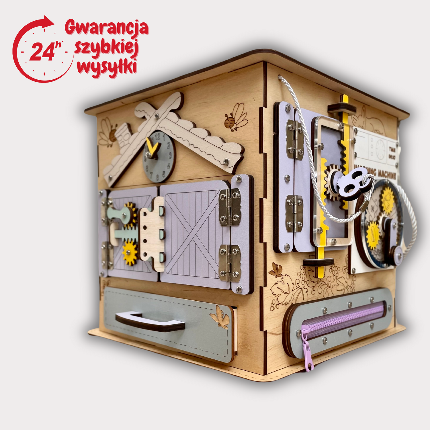 Zabawka posiada sorter, obracające się zębatki, tunel z kulkami, szufladkę, monety z cyframi, sznurówkę i wiele innego!